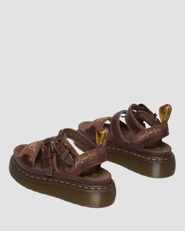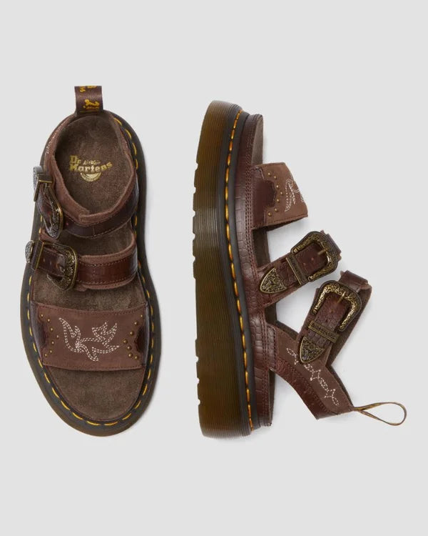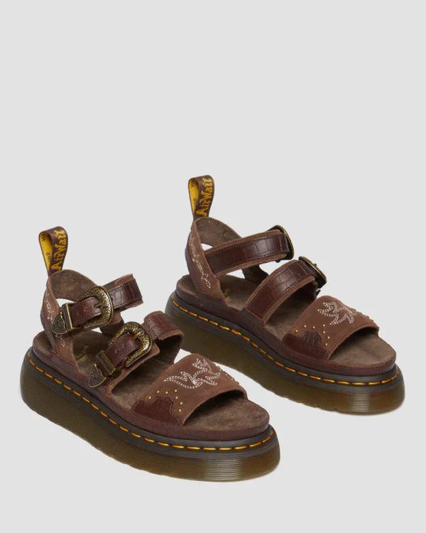 Challenge conventional footwear norms with this Gryphon sandal, a bold fusion of industrial edge and western heritage. Crafted from supple Classic Pull Up leather and suede, it delivers comfort without compromise. The commanding platform sole—anchored by signature yellow welt stitching—commands attention, while intricate white embroidery and dual adjustable buckles provide both visual intrigue and practical fit customization. Finished with an iconic AirWair heel loop, this piece redefines what western styling can be.